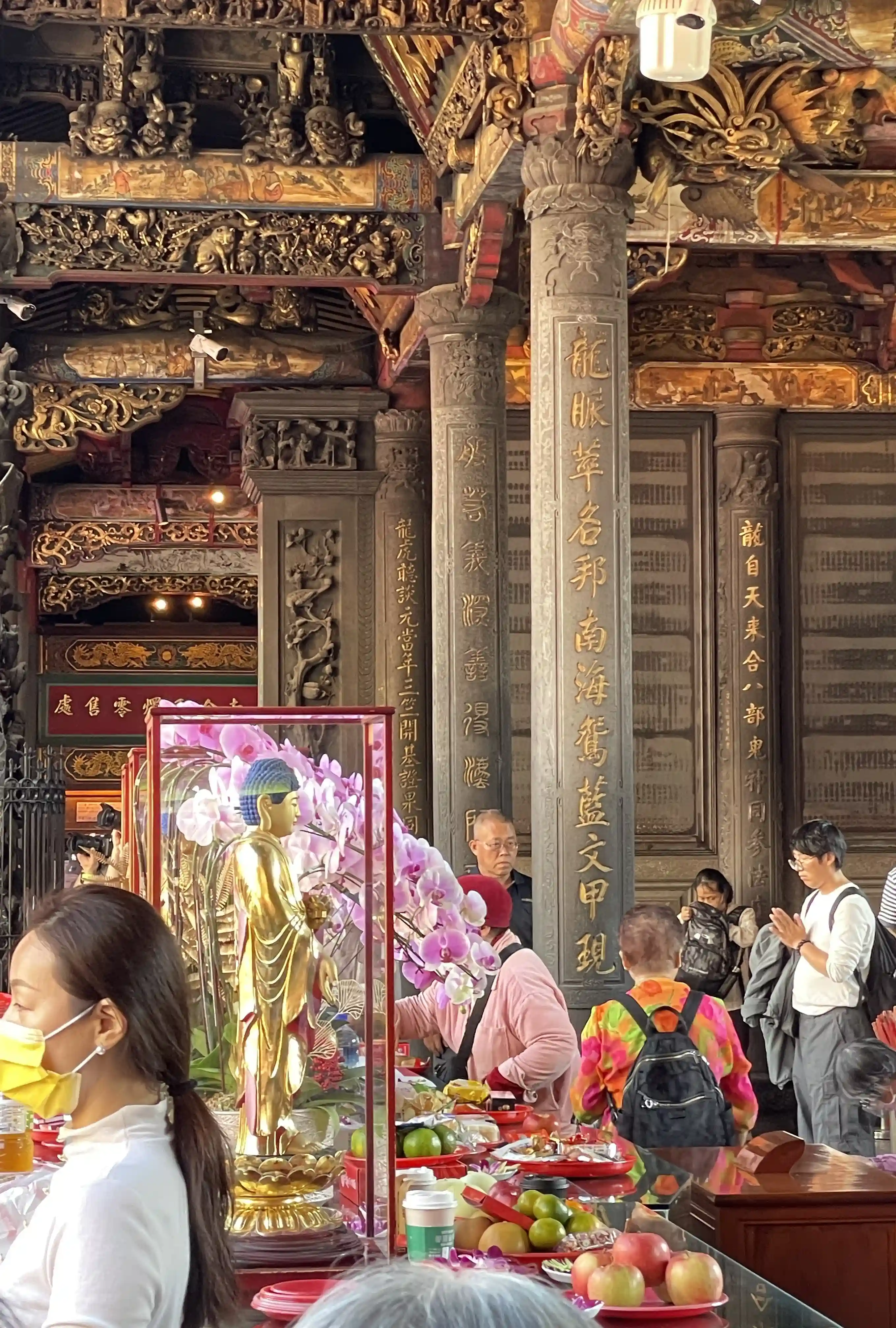 Daarna bezoek ik de Longshan Temple. Zodra ik naar binnen stap, hangt de lucht zwaar van wierook en zie ik bezoekers met bundels brandende stokjes bidden en buigen. Jeetje, wat is het hier druk. Deze tempel verenigt elementen uit het boeddhisme en taoïsme en is gewijd aan Guanyin, de godin van mededogen. De hele dag door komen locals hier offers brengen en vragen om bescherming of geluk.