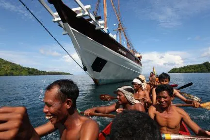 Het luide geschal van de scheepshoorn kondigt onze aankomst aan in het pittoreske haventje van Bandaneira. Vanaf het hoogste dek kijken we met gemak over het eiland heen. Het uitzicht is werkelijk schitterend. De weelderig begroeide Banda Eilanden liggen als groene parels in een helder blauwe zee. De met lava bedekte flanken van de conische vulkaan Gunung Api maken het geheel tot een perfect plaatje van een tropisch paradijs..