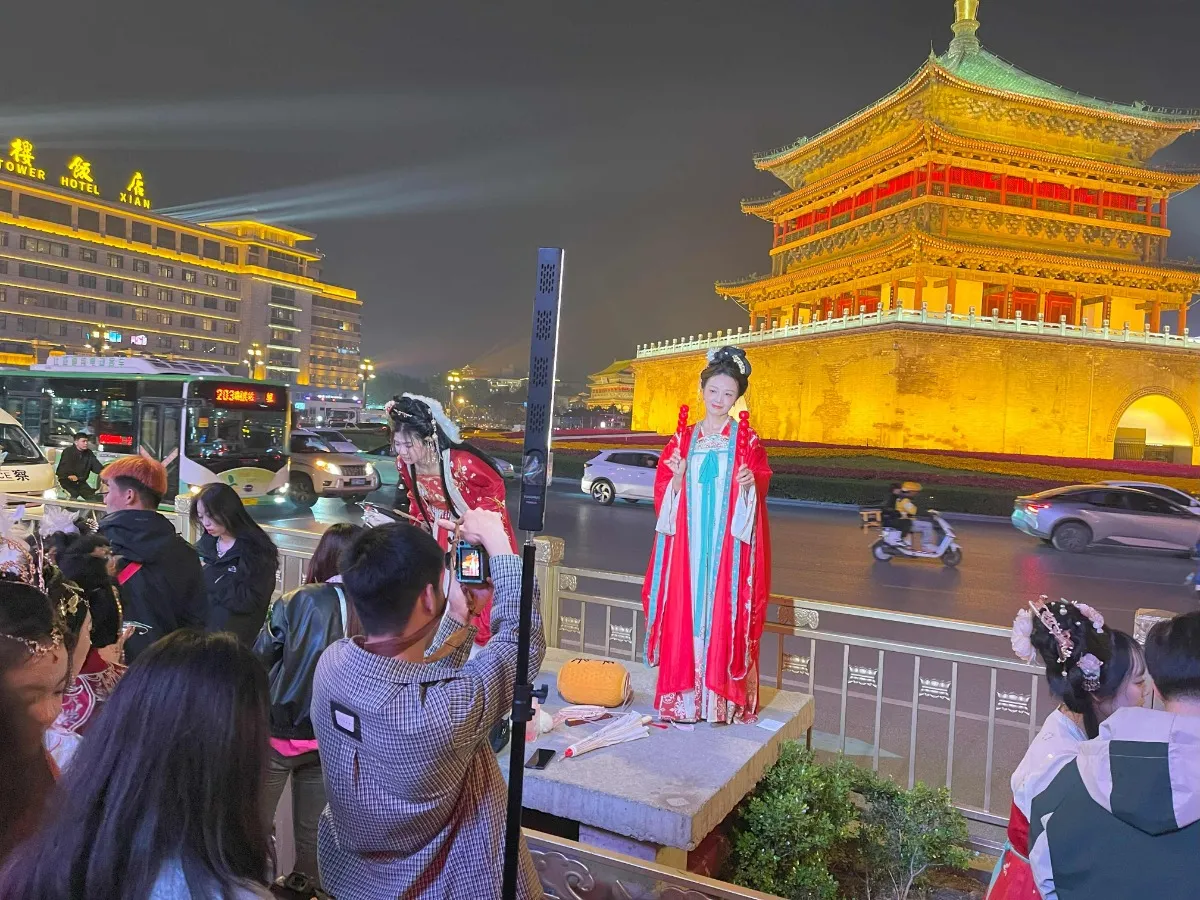 En dan zie ik er nog een. En nog een. En daar! En huh? Tang dames worden ook nog eens geflankeerd door dames uit de Han. Een tweede periode (rond het jaar nul zeg maar) uit de Chinese geschiedenis waar de Han Chinezen hun cultuur aan te danken hebben. Ik zie ook een hoge ambtenaar lopen met zo'n enorme hoge toren op zn hoofd. Precies zoals ik in het museum zag vanochtend! En hoe dichter ik bij de Klokkentoren kwam, hoe meer Tang- en Han figuren om me heen verzamelen. Op de trappen, uit de warenhuizen, op meegenomen kratjes, voor de mobiele camera's met traditioneel snoepgoed, een hartige snack op een stokje of een waaier in de hand. Niet tien maar honderden. Echt Waar. Vrijdagavond TikTok-avond in het centrum van Xian! Net zoals alle vrijdag- en zaterdagavonden. De jeugd vertoont zich in deze prachtige kleding uit die andere glorieuze Chinese Tijd. De een nog eleganter dan de ander. Met glitter make-up en sierlijke glanzende haarspelden. Door TikTok trekken ze hier en masse naar toe. Hartstikke gezellig. Straatbandjes, dansacts, etenstalletjes met dampende potten en pannen, krukjes om de buitenbarretjes heen. Je kunt er van alles eten. Van traditionele happen uit Shaanxi provincie, via heetzure noedelsoepen tot aan Japanse Takoyaki met Chinese afdronk. In het centrum van Xian is het alle avonden feest. Vooral in het weekend!