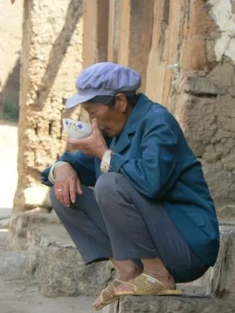 'Kom binnen, kom binnen' , gebaart de man des huizes. Zijn blauwe verschoten pet staat scheef op zijn hoofd. Een oude vrouw met om haar hoofd een lange zwarte sjaal gewikkeld, steekt haar hoofd verlegen maar nieuwsgierig om de deur. Haar ogen hebben staar, ze knippert tegen het felle licht en kijkt naar beneden. Ze draagt haar katoenen blauwe jasje met verve. Voor haar borst een zwarte lap in ruitvorm met prachtig geborduurde vogels en bloemen erop. De kleuren zijn verschoten maar het is nog steeds vrolijk en vertederend. Ook zij draagt de lappen gewikkelde zwarte stof om haar schenen met daarover de reepjes witte katoen kruislings omgebonden. Ik kijk verder naar beneden en schrik. Krijg er een ietswat draaiend gevoel van in buik en hoofd. Lotusvoetjes. De oude vrouw heeft gebonden voeten. Piepkleine geborduurde schoentjes draagt ze. Blauwe schoentjes met roze, witte en groene bloemetjes erop geborduurd. In het Chinees noem je de voeten San cun Lian jiao of wel lotusvoeten van 3 cun (een cunis ongeveer 3 centimeter). De oude moeder van de gastheer is 82. Ik moet meteen denken aan het verhaal van een vriend die ooit eens zo moedig was om te vragen of ie mocht zien hoe haar voeten er uit zagen en of ie het mocht zien. Hij kreeg het voor elkaar en kan nog steeds zijn ogen van toen niet geloven. Enkel de grote teen zou over zijn. De rest van de tenen zijn aan elkaar vergroeid tot een klompje. De voeten zijn op zeer jonge leeftijd al bij elkaar gebonden om uiteindelijk dit aantrekkelijke resultaat te verkrijgen. Het moet opwindend geweest zijn voor de man. Hoe kleiner de voet, hoe meer de man zich aangetrokken zou voelen tot de vrouw. Gelukkig is de lotusvoet enkel nog te zien bij vrouwen van de oude generatie. Over 20 jaar zullen er geen lotusvoetjes meer zijn.