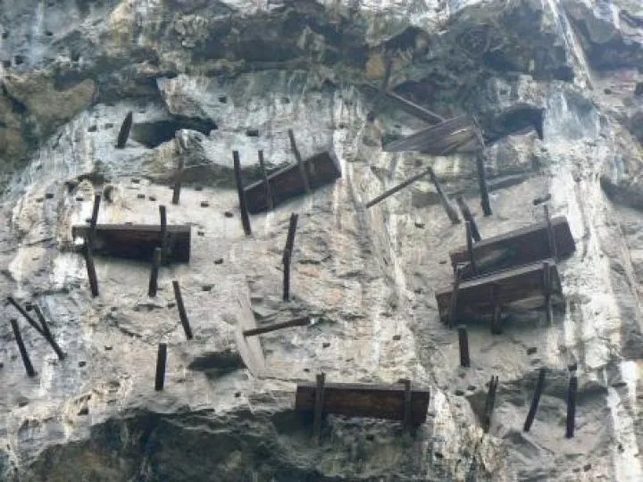 Deze twee bezienswaardigheden liggen in de buurt van Yibin en met het huidige verbeterde wegennet moet dit een fluitje van een cent zijn. Helaas ontbreekt de snelweg naar Luobiao, het dorp waar houten doodskisten daterend vanaf 1470 nog steeds op houten palen balanceren, die op mysterieuze wijze hoog in een stijle rotswand geslagen zijn. In ruil voor een snelweg krijgen we een putten-en –holen-wegdek waar we heerlijk onze ruggen door mogen laten masseren de hele dag. Aan het eind van de dag komen we aan in Luobiao waar de doodskisten er inderdaad bij hangen zoals op het plaatje. Wellicht een leuke bezienswaardigheid voor toeristen wanneer men ooit bedenkt om de weg ernaar toe te asfalteren. Nu is het een tantaluskwelling. De Bamboezee heb ik niet mogen zien. Dat zou nog uren hobbelen terug zijn. Morgen staat in het noordoosten van Yunnan mijn volgende chauffeur te wachten. Ik moet verder.