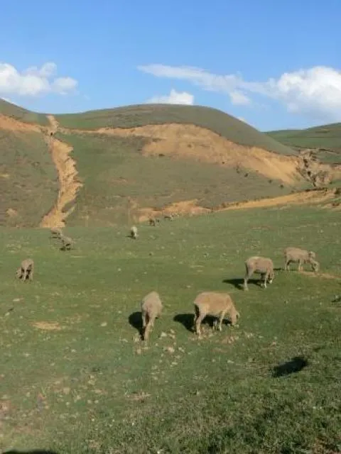 De lucht is blauw. Schapenwolken drijven langzaam voorbij boven het frisse korte groene gras. De schapen grazen luidruchtig in de volkomen stille omgeving. Een zee van gras, heuvelachtig en sereen op gemiddeld 3000 meter. Je voelt het als je een helling op moet. Ik ben sneller buiten adem dan normaal. Twee meisjes met knalrode jakjes aan laten hun varkens uit in het groen. Ze liggen languit op het gras, breed lachend als ik vanuit de verte naar ze zwaai en aanstalten maak om naar ze toe te komen lopen. Brede grijnzen op hun pure gezichtjes.