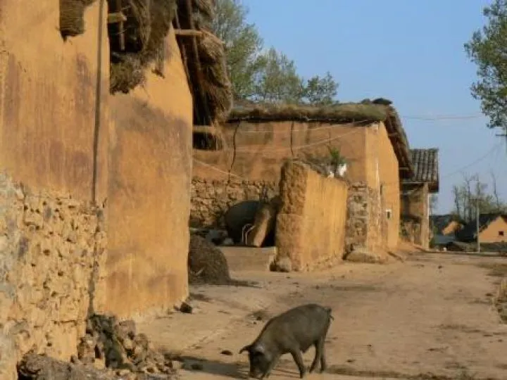 ‘Zijn dat jullie varkens? Geen antwoord. Zijn het de varkens van papa en mama?’ Ik probeer ook maar wat. Weer geen antwoord. Verstaan jullie me niet? Dan zegt de oudste meteen daarop: nee, ik versta je niet.’ Weer een brede grijns. Dan maar een snoepje van mijn Chinese reisgenoot. Snoepjes maken altijd vrienden. Ik denk meteen aan slechte gebitten en meer van die morele nobele gedachten maar mijn reisgenoot uit de grote stad Zhengzhou in het oosten van China, kijkt me verbaasd aan. Waar ik me druk om maak. Het roodlemen dorpje Dashanbao ligt er prachtig bij in het avondlicht. Het is er rustig want iedereen is nog steeds op het veld in de graslanden om onkruid te wieden, schapen of varkens uit te laten of paarden te laten grazen. Op een paar kinderen na. Ze komen nieuwsgierig kijken. Als ik mijn mond open doe, vluchten ze naar binnen al schaterend en dansend. Ik steek mijn hoofd even door het donkere gat van de deuropening. Een kale donkere ruimte, een lemen vloer.