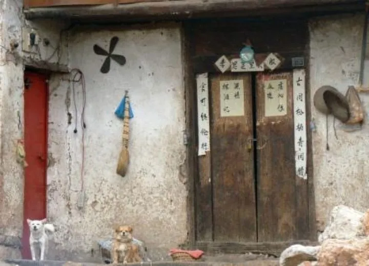 Op de ruwe houten deuren in de lemen muur die toegang bieden tot een kleine binnenplaats, hangen twee kleurrijke deurwachters van papier. Om de dolende zielen buiten de deur te houden en het huishouden te beschermen tegen al het kwaad dat maar binnen zeilen kan. Rode stroken papier met daarop kleine gedichtjes die elk nieuwjaar weer vers op de deurposten worden geplakt, nodigen de gast uit om aan te kloppen. De gedichtjes wensen iedereen die door de deur komt veel geluk en voorspoed. Aan de deurpost hangt een oud colablikje met een bosje afgestoken wierookstaafjes.