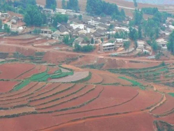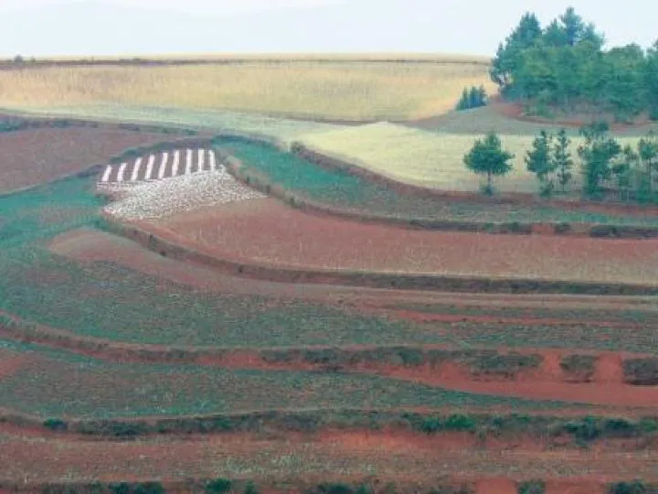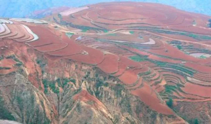 De knalrode aarde van deze regio, district Dongchuan, zo'n 160 km ten noorden van Kunming wordt bebouwd met koolzaad, aardappelen, gerst en mais. Omdat deze regio op gemiddeld 2500 meter ligt, wordt het hier nooit heel heet. Regen valt er wel. Vooral in juli en augustus. Dan is het geen goed moment om hier naar toe te reizen. De gewassen zijn erop afgestemd. Prachtige terrasbouw. Kleine stukjes land op heuvels en tegen hellingen als een bruidstaart van 20 verdiepingen worden bebouwd met de verschillende gewassen. Het koolzaad geeft hier witte bloemen, de aardappen ook. Het gerst is zilverachtig grijs, de mais groen, gelardeerd met knal rode lijnen van de rode aarde. Het is alsof je naar een abstract schilderij staat te kijken waar de kunstenaar de kleuren perfect op elkaar heeft afgestemd. Het is mei en de velden geven nu prachtige kleuren. De heldere luchten geven wonderschone effecten vooral tijdens zonsopkomst en -ondergang. Door de verplaatsing van de wolken en het draaien van de zon, verandert het plaatje constant. Het lijnen-, vlakken- en kleurenspel dat hier wordt gespeeld lijkt onuitputtelijk. Je kunt er een hele dag naar kijken.