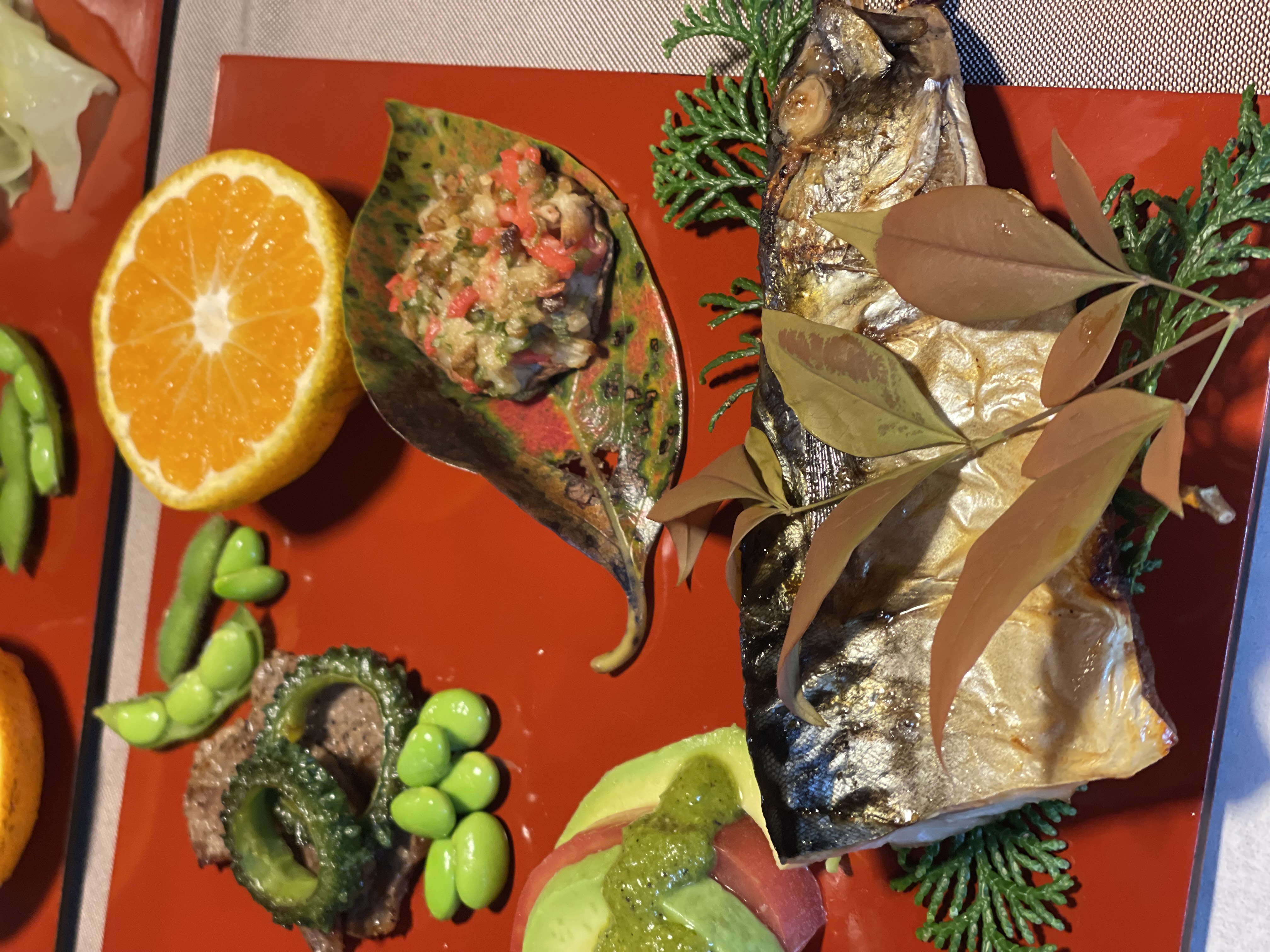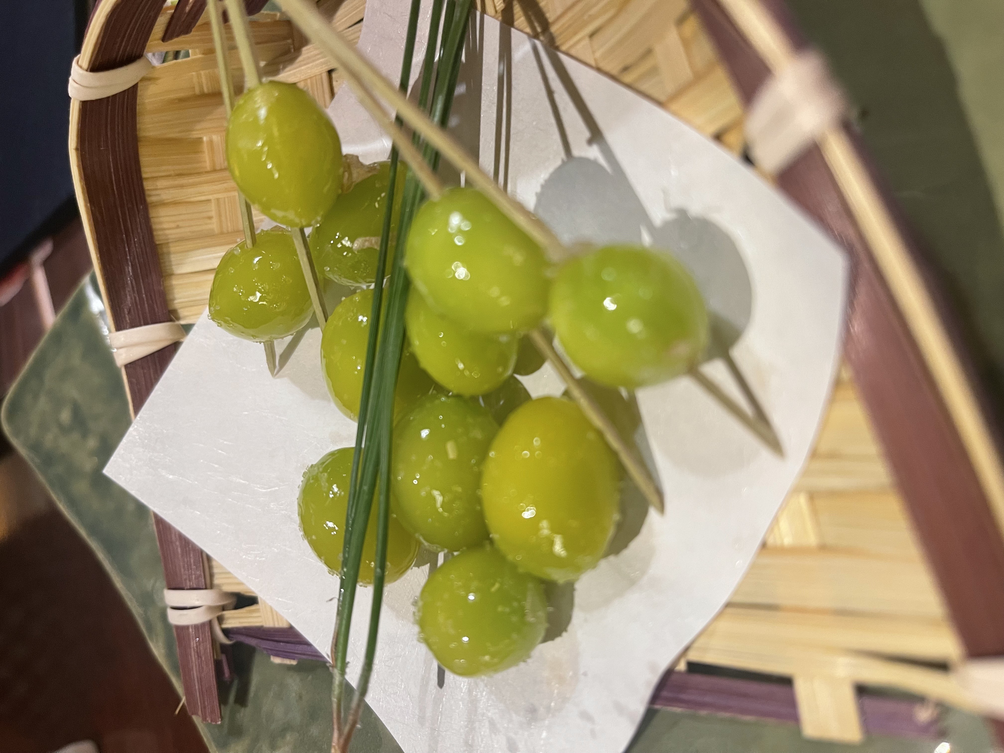 Naast dit schaaltje staat een rieten mandje met ginnan, smaragdgroene vruchtjes die de kok aan houten stokjes heeft geprikt. De heldere kleur groen valt meteen op. Is dit nou een druif of een olijf misschien?