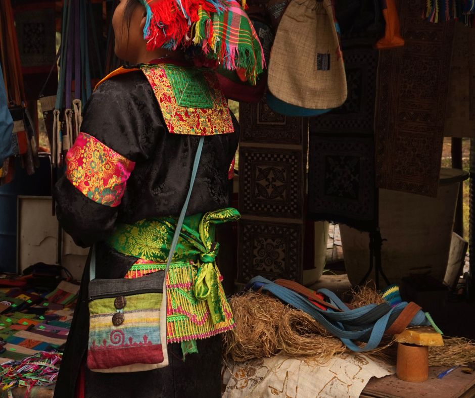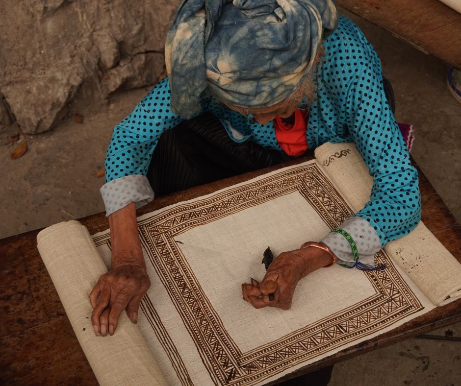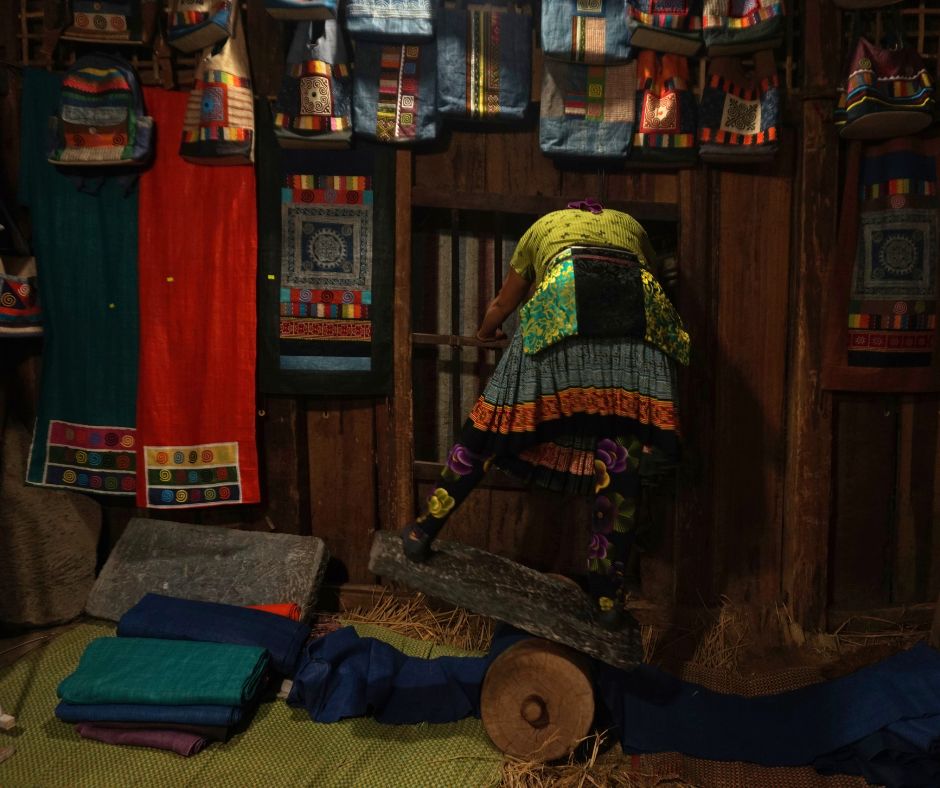 We worden op een krukje gezet en krijgen meteen wat zelfgebrouwen happy water aangeboden. De hele familie (van de baby tot de rimpelige oma) slaapt en woont en kookt in dit ene hutje. Super bijzonder om hierbij aanwezig te mogen zijn! Dezelfde dag delen we ook nog een kop thee bij een vriend van onze easyrider die hoog in de mistige bergen woont en gaan we op bezoek bij een groep vrouwen die hun eigen bedrijf heeft in het met de hand maken van stof van hennep, dat ze vervolgen met bijenwas betekenen en kleuren met natuurlijk hulpbronnen uit de omgeving. Aan de hand van het oudste vrouwtje (95 jaar!) kun je zien dat dit hier al een tijdje zo gebeurd.