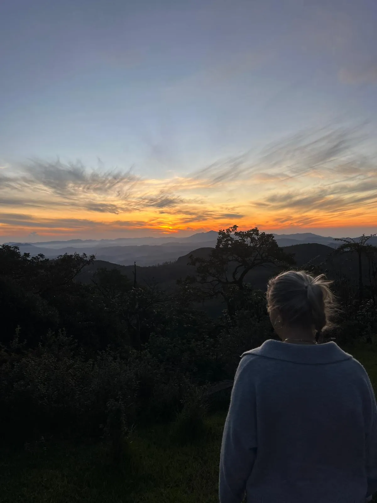 De rit naar Horton Plains duurde ongeveer een uur. Onderweg maakten we een korte stop om de zonsopkomst te bewonderen. We bevonden ons al op een behoorlijke hoogte, en het uitzicht over de bergen terwijl de eerste zonnestralen door de wolken braken, was adembenemend.