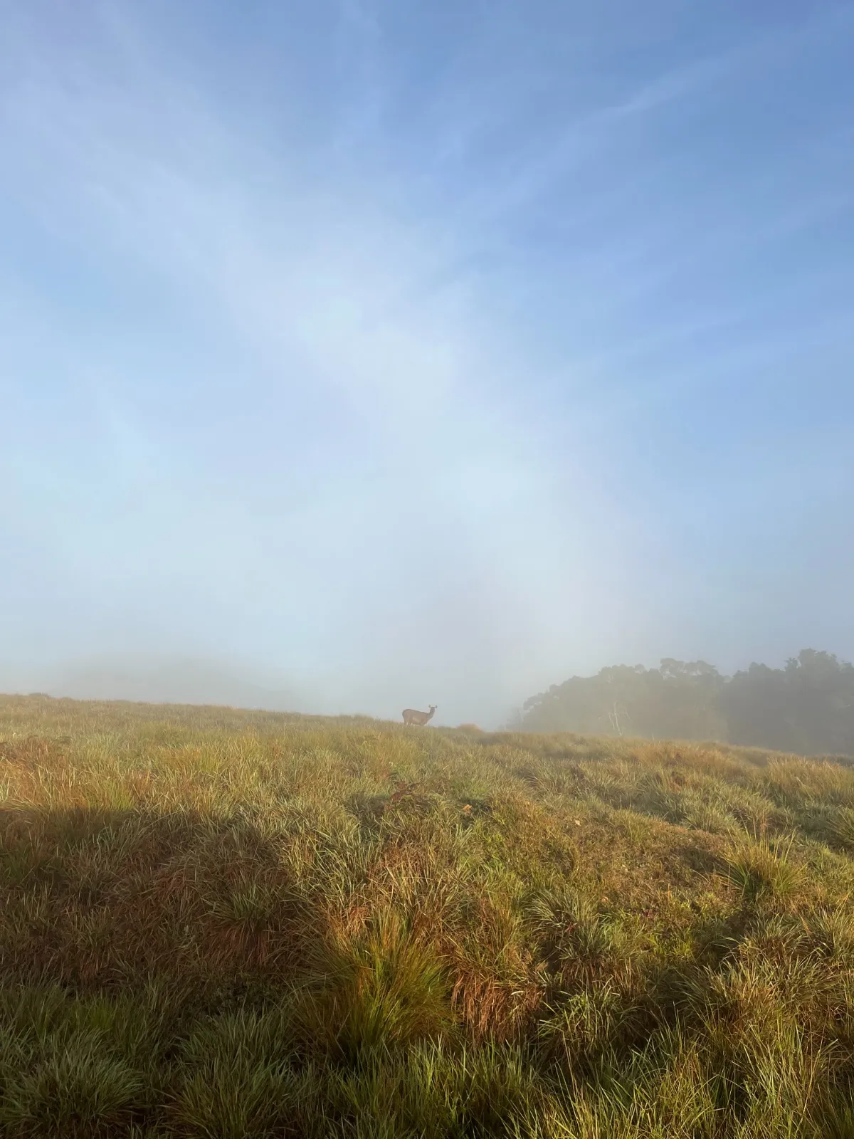 Stipt om zes uur ging het park open, en dankzij onze fijne en meedenkende chauffeur stonden wij al klaar om naar binnen te gaan! Het eerste deel reden we met de auto, het was werkelijk prachtig. Een dunne mist hing boven de uitgestrekte velden, en overal om ons heen zagen we Sambar herten rustig grazen in het ochtendlicht. Het voelde als een scène uit een sprookje. Onze chauffeur vertelde ons al van alles over de Horton plains en ook vooral welke dieren er te zien zijn. Hij had zelfs ooit een Luipaard gespot! Maar dan moet je wel heel veel geluk hebben. Hij vertelde dat er onder meer apen, otters, vele vogels, kikkers en vissen te spotten zijn.
