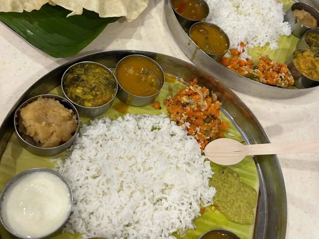 Thali: een metalen dienblad vol kommetjes curry en dal – vers, gevarieerd en voedzaam.