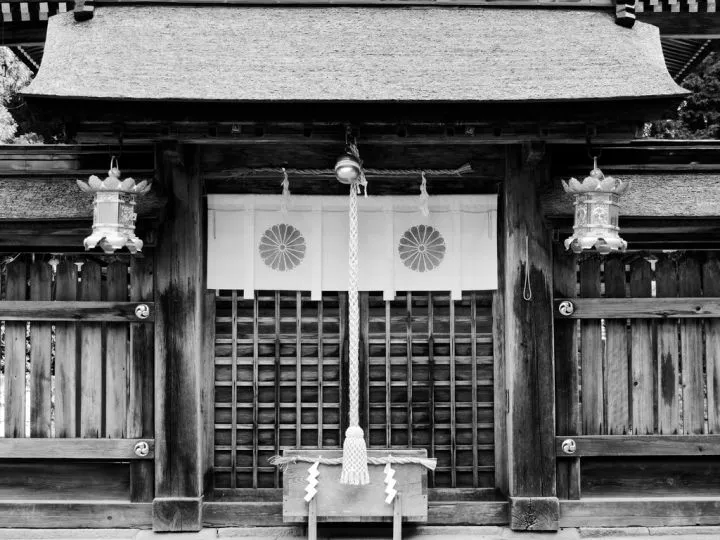 Voor een volgend schrijn hangt een horizontaal gevlochten stuk touw waar witte zigzaggende vaandeltjes aan hangen, het teken dat we hier te maken hebben met heilige grond waar een kami huist. De kami kun je aanroepen door aan een bel te rammelen en dan twee keer in je handen te klappen. De kami weet dan dat je er bent. Je buigt een keertje diep en wend je tot de kami met je gebeden, wensen of een vraag.
