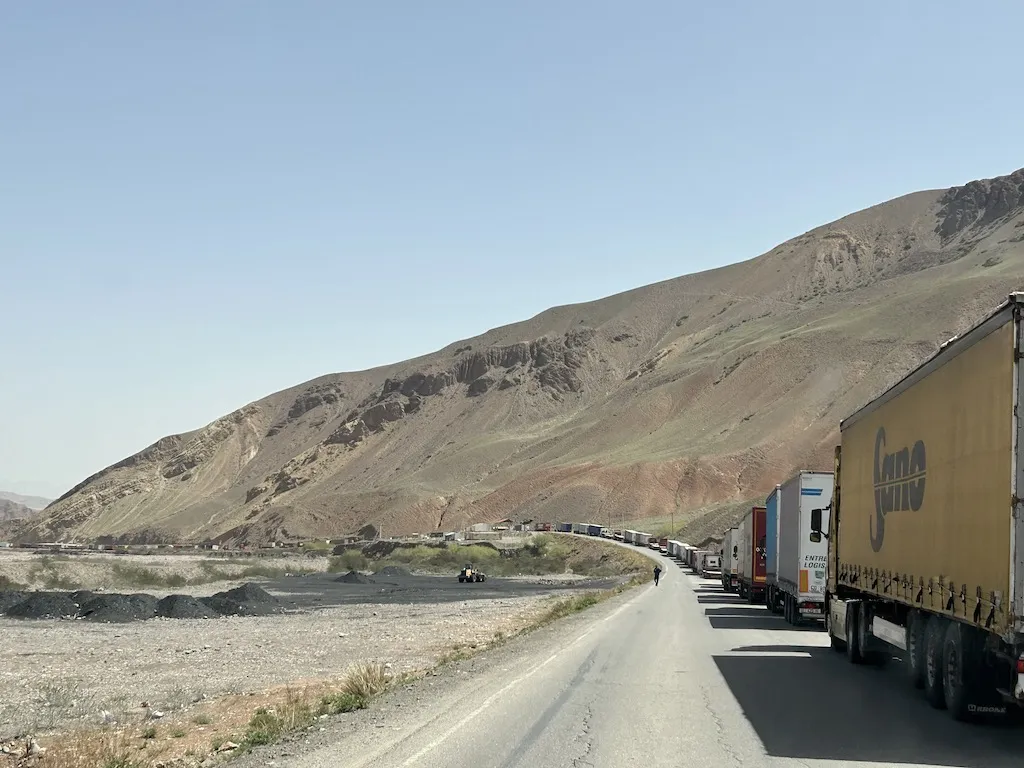 Na de eerste Kirgieze controlepost (even paspoort check en door) reis je verder en passeert het laatste Kirgiese dorpje Nura. Vanaf hier zie je een eindeloze slinger aan trucks (die goedkope Chinese producten komen ergens vandaan en hier zie je dat met eigen ogen). Gelukkig kun je langs alle trucks rijden en een half uur later sta je bij de Kirgiese grens. Hier heb je bagage controle en paspoort controle en wordt je uitgestempeld.
