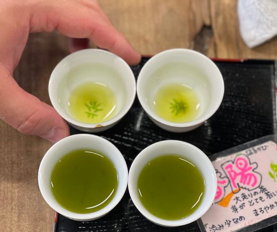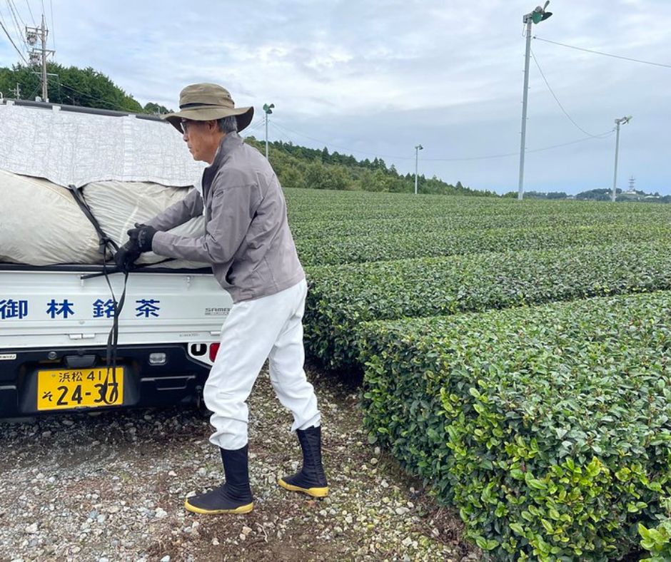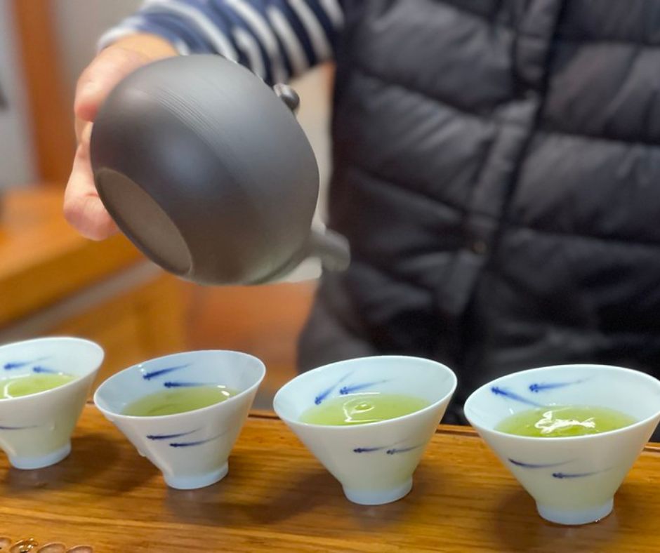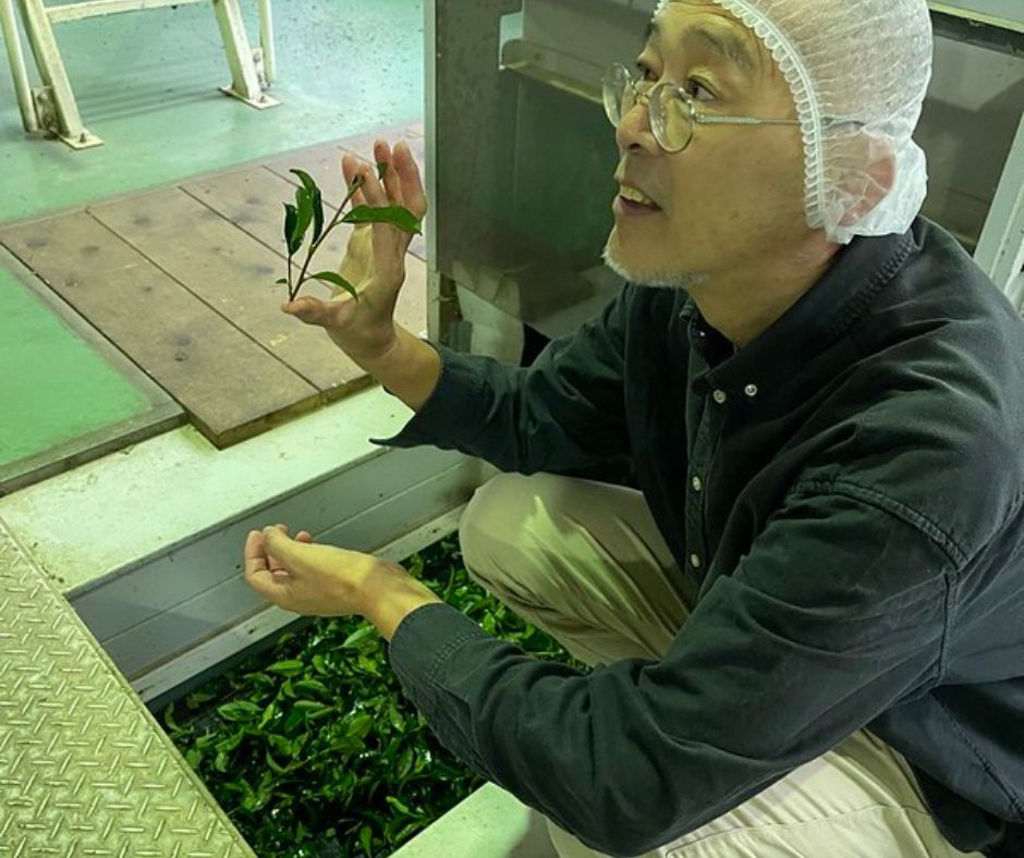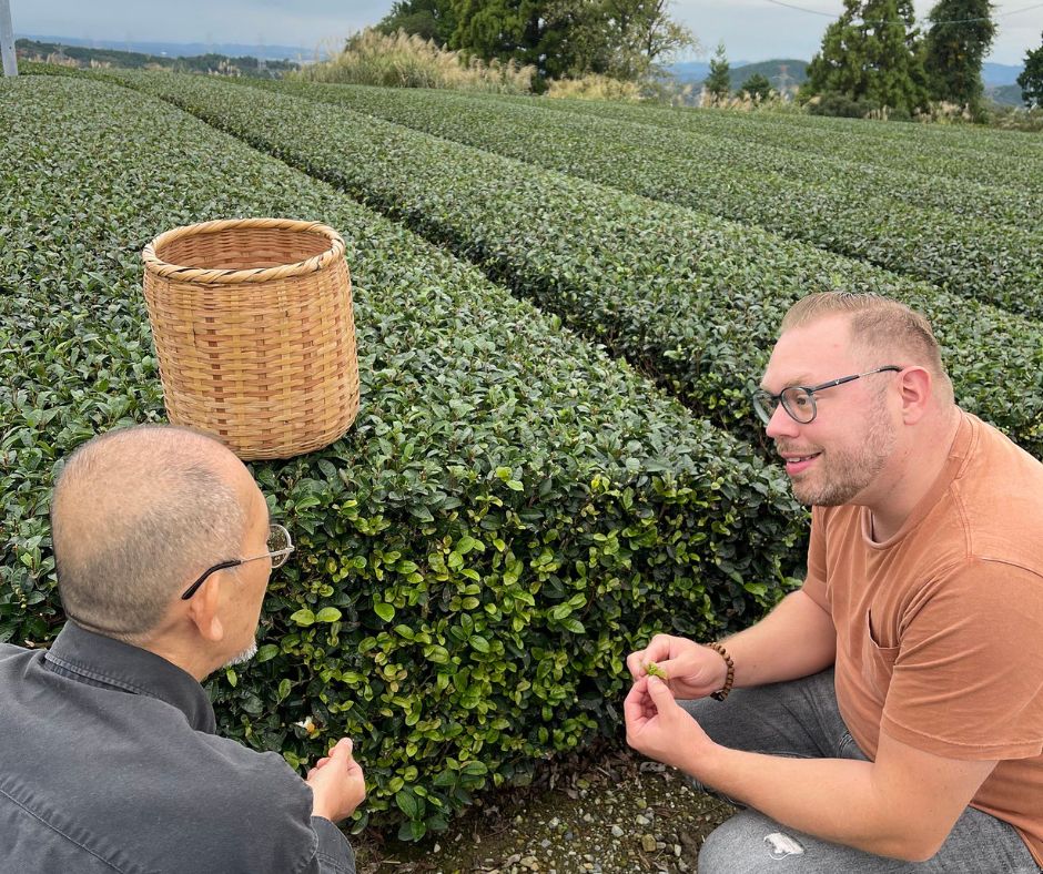 Het is maar een dik uur treinen vanuit Tokio naar Kakegawa, vlakbij de stad Shizuoka. Onze gastheer Koichi staat ons op te wachten op het station van het kleine stadje. We worden in een mini-pausmobiel gehesen en even later rijden we al dwars door de theevelden en stoppen we bij een gigantische lichtgroene doos. Dat is de theefabriek van deze omgeving. Daar worden de blaadjes naartoe gebracht om ze te wassen, te stomen, te drogen en te borstelen. Dan is de Sencha thee klaar. Hoogwaardige groene thee die je laat trekken in heet water, niet kokend heet want dan wordt je thee te bitter.