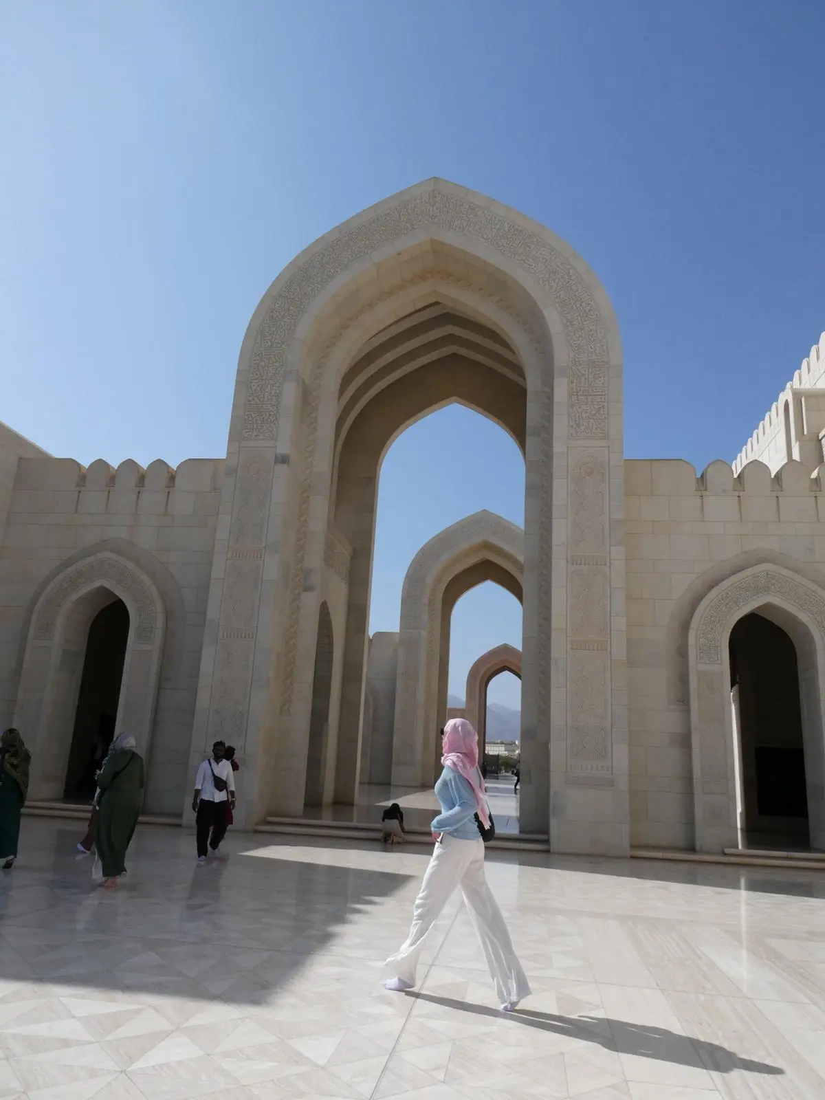 De eerste ochtend besteden we aan het bezoeken van de Grote Moskee van Muscat. Gelukkig hadden we al wat uurtjes geslapen, waardoor we fris en vol energie rondkijken. De moskee is indrukwekkend: invloeden uit onder andere Turkije, Myanmar en Oostenrijk komen samen in de architectuur, met een schitterende Swarovski-kroonluchter als hoogtepunt. Na een rondleiding drinken we traditionele Omaanse koffie, aangelengd met water en gekruid met kurkuma, verrassend lekker!