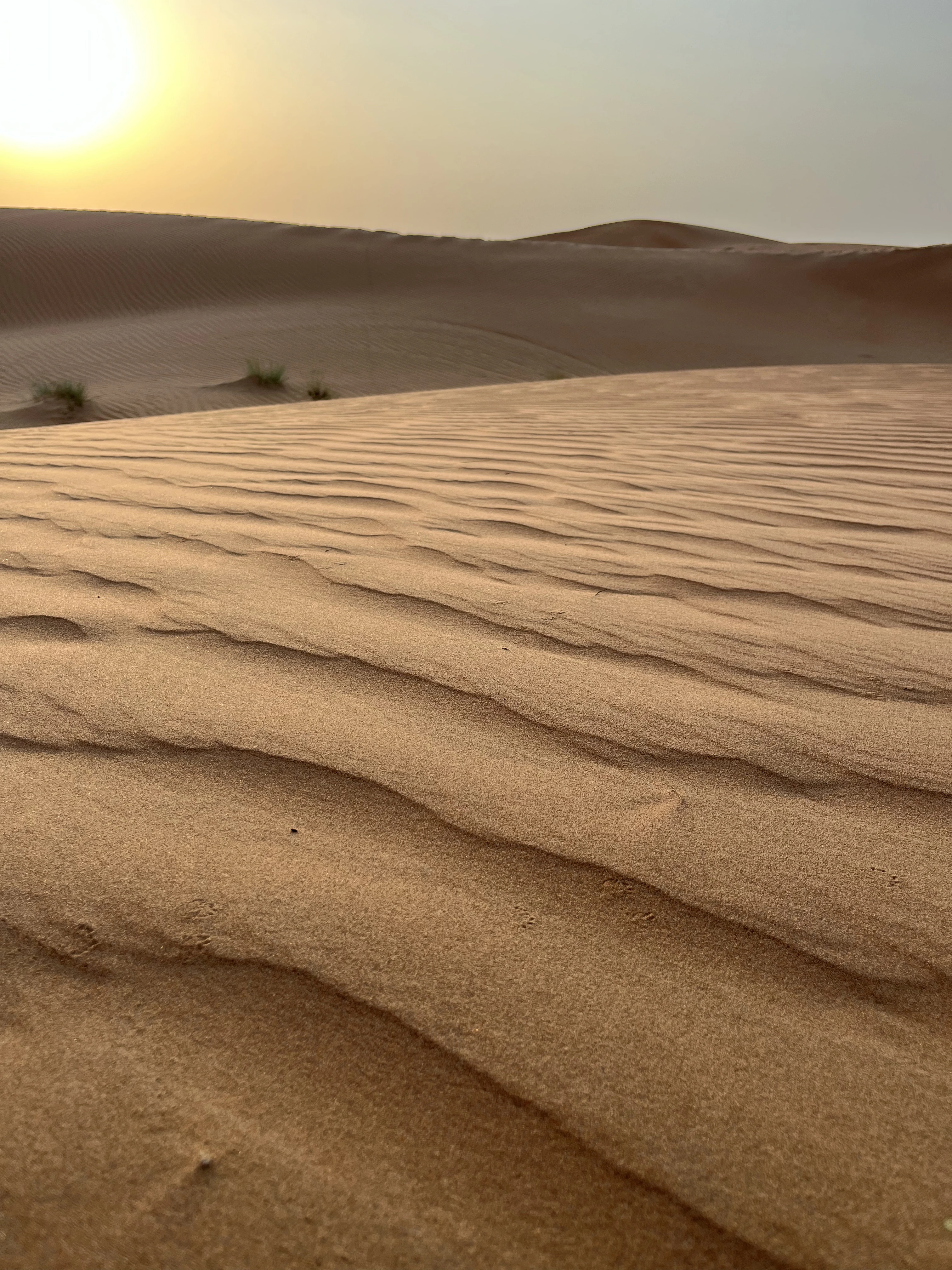 Een van de hoogtepunten van de reis is de vroege ochtend in de woestijn. Om 4:40 uur staan we op, nog in het donker, en wandelen naar de top van een duin voor de zonsopgang. De stilte en de verandering van licht over het zandlandschap zijn indrukwekkend. Na het ontbijt in het kamp vertrekken we richting Muscat, via de woestijn en groene wadi’s.