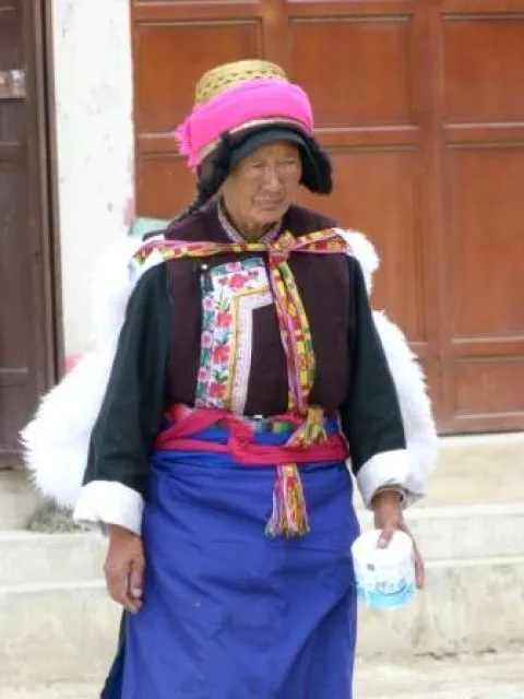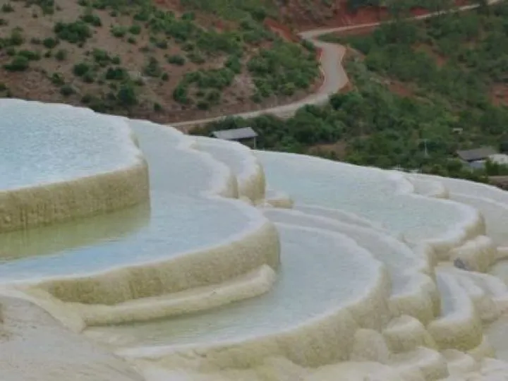 Het weer begint gelukkig beter dan gister en met een zonnetje rijden we de Tiger Leaping Gorge in. Hier stroomt de Yangtse door een nauwe kloof, een fantastisch natuurfenomeen. Dit is ook een van de bekendste trekkingstochten in China. In een of twee dagen loop je hoog over de rotswanden van de kloof met enorme bergketens om je heen en ver in de diepte de bulderende Yangtse rivier. Wij hebben hier helaas geen tijd voor en rijden over een gloednieuwe weg door de kloof, ook een fantastische rit. Als we na een uur rijden de kloof uit zijn, rijden we verder langs de Haba snowmountain, ook een bekend trekkingsgebied en wederom een prachtige omgeving met Naxi dorpjes aan voet van de berg. We spreken even met een Naxi vrouw die inmiddels zes keer naar de top is geklommen. Dan rijden we door een prachtig landschap verder naar Bashuitai. Hier een volgend natuurfenomeen; witte kalksteenterrassen waar het water kleine poeltjes vormt en langzaam naar beneden druppelt. Het is ook de geboortegrond van de Dongba cultuur, de sjamanistisch-boedhistische religie van de Naxi bevolking.