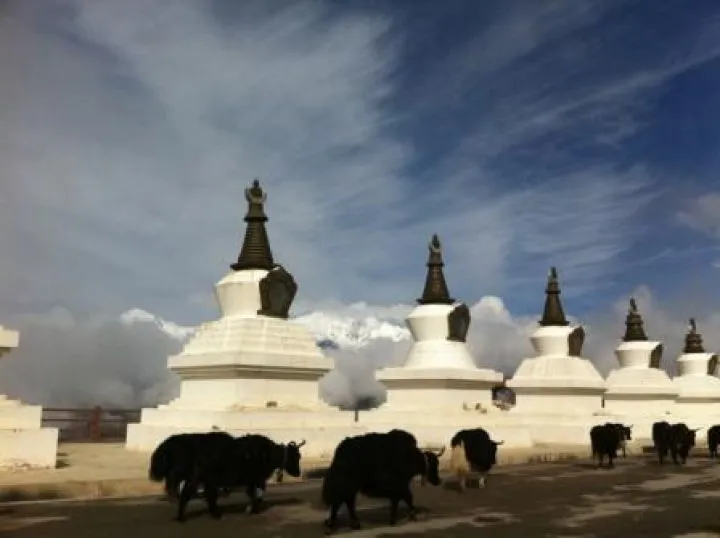 Maar voor de rest niks dan goeds; ik heb een fantastische dag gehad. Vanochtend in Deqin weer vroeg opgestaan en dit keer met meer succes. Tussen de wolken door kwamen de verschillend pieken van de Meili snowmountain te voorschijn, waaronder de heiligste berg zelf; Kawa Karpo. Een fantastisch gezicht. De vele wolkenflarden zorgen voor een mystiek geheel; het ene moment was die piek zichtbaar, het volgende moment een ander en soms de gehele bergketen. Na het ontbijt naar een serie stupa 's gereden met fantastisch uitzicht. Hoewel het een 'scenic point' is (lees: mooi uitzichtpunt waar je entree voor moet betalen), is het zeker niet alleen maar toeristisch. Tibetaanse vrouwen lopen rondjes rond de stupa 's. Een boer laat zijn yaks uit, iets verderop licht een Tibetaanse mastiff hond en pelgrims bidden tot de heilige berg. We kijken gefascineerd toe . Vervolgens maken we een prachtige tocht door de bergen, over een 4300 meter hoge pas en langs de Baima snowmountain. Dezelfde tocht, maar dan omgekeerd, als twee dagen geleden, maar met blauwe luchten en zonlicht, ziet het er toch een stuk mooier uit.