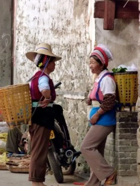En er zijn alternatieven om in Dali te slapen. Ik bezoek eerst het dorpje Zhoucheng, met een mooie markt vol Bai vrouwen met hun karakteristieke hoofddeksels. Maar mijn favoriet is het dorpje Xizhou, waar ik in een fantastisch sfeervol hotel overnacht. Zo'n hotel waar je dagenlang zou willen verblijven. Het is een oud familiehuis van een welgestelde Bai familie, opgetrokken rondom 4 binnenplaatsen. Er is nu een bijzonder aangenaam hotel van gemaakt, omringd door de witte huizen van Xizhou, rijstvelden, de bergen op de achtergrond en een fietstochtje weg van het Erhai meer.