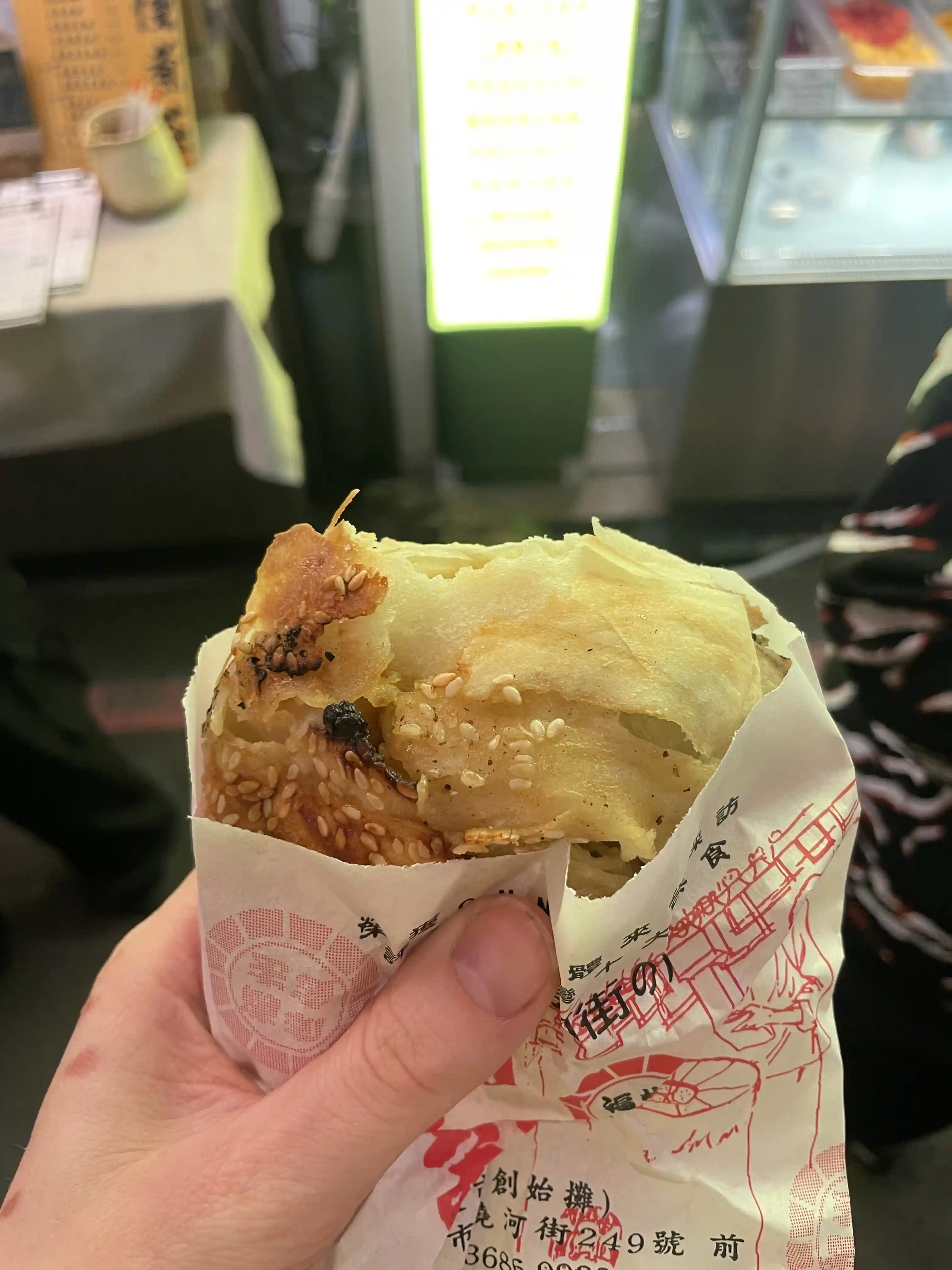Ik wissel het broodje van hand tot hand voordat ik een hap neem. Er kringelt stoom omhoog. Met half geopende mond hap ik lucht om het iets te laten afkoelen. Maar wat is dit goed. Knapperig van buiten, sappig en kruidig van binnen en vooral ook erg heet. Dit is nou zo'n broodje dat je snel even tussendoor haalt als lunch, snack of aperitief, al vind ik hem wel verrassend snel vullen in combinatie met de bubbelthee!