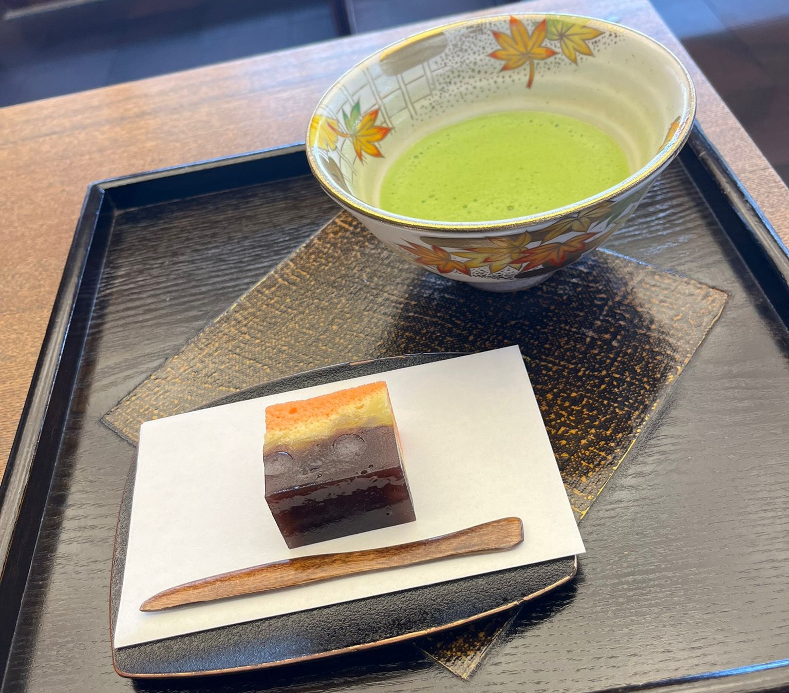 Hoe dan ook was de matcha die wij hier kregen de beste die ik ooit heb gedronken. Je proefde meteen dat het zo puur en vers was, echt fantastisch! Bij de matcha kregen we een red bean cakeje geserveerd wat er goed bij paste qua smaak.