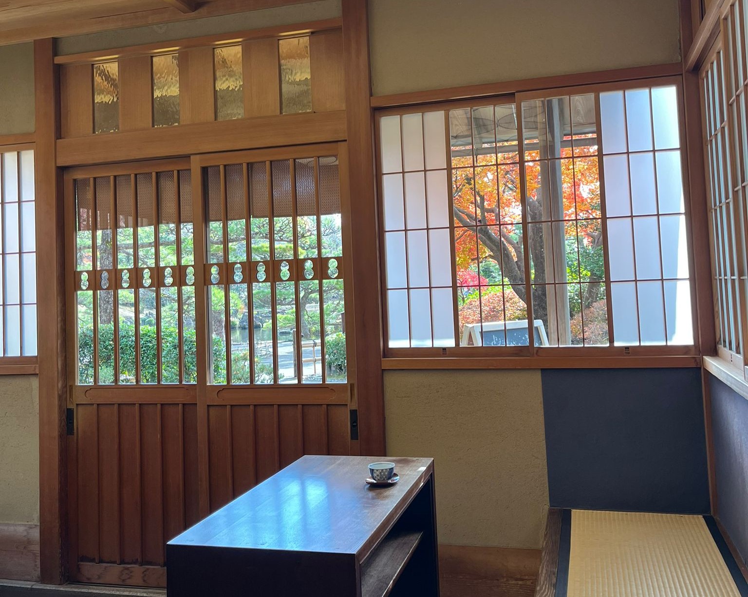 In de botanische tuin is een mooie tea room te vinden waar Japanse dames op traditionele wijze matcha en groene thee uit de regio bereiden. In deze specifieke tea room bereiden ze het in de keuken en kun je het proces dus als bezoeker niet zien. Op andere plekken worden ook theeceremonies gehouden, waarbij je wel het hele proces kunt aanschouwen. Misschien willen ze hun specifieke manier hier wel geheimhouden...