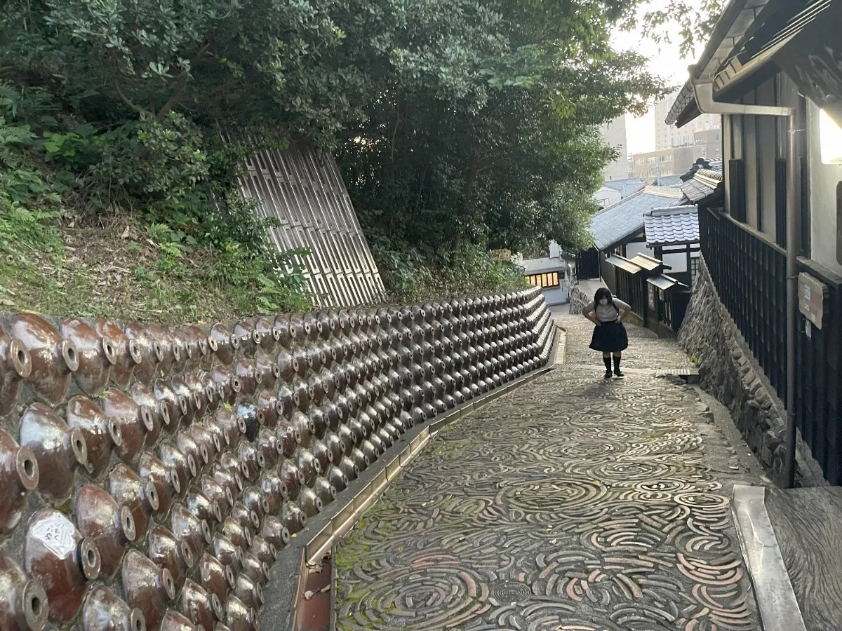 Op zoek naar Hill House 2 waar we slapen vannacht, lopen we plots over de Dokanzaka paden waar ik eerder over las. Een meisje in schooluniform loopt ons tegemoet. Deze oude dorokan ofwel aardewerken buizen zijn hier gebruikt in het pad en voor de muren aan de zijkant. Die dorokan werden hier in Tokoname gemaakt in de vele ovens die je overal ziet.