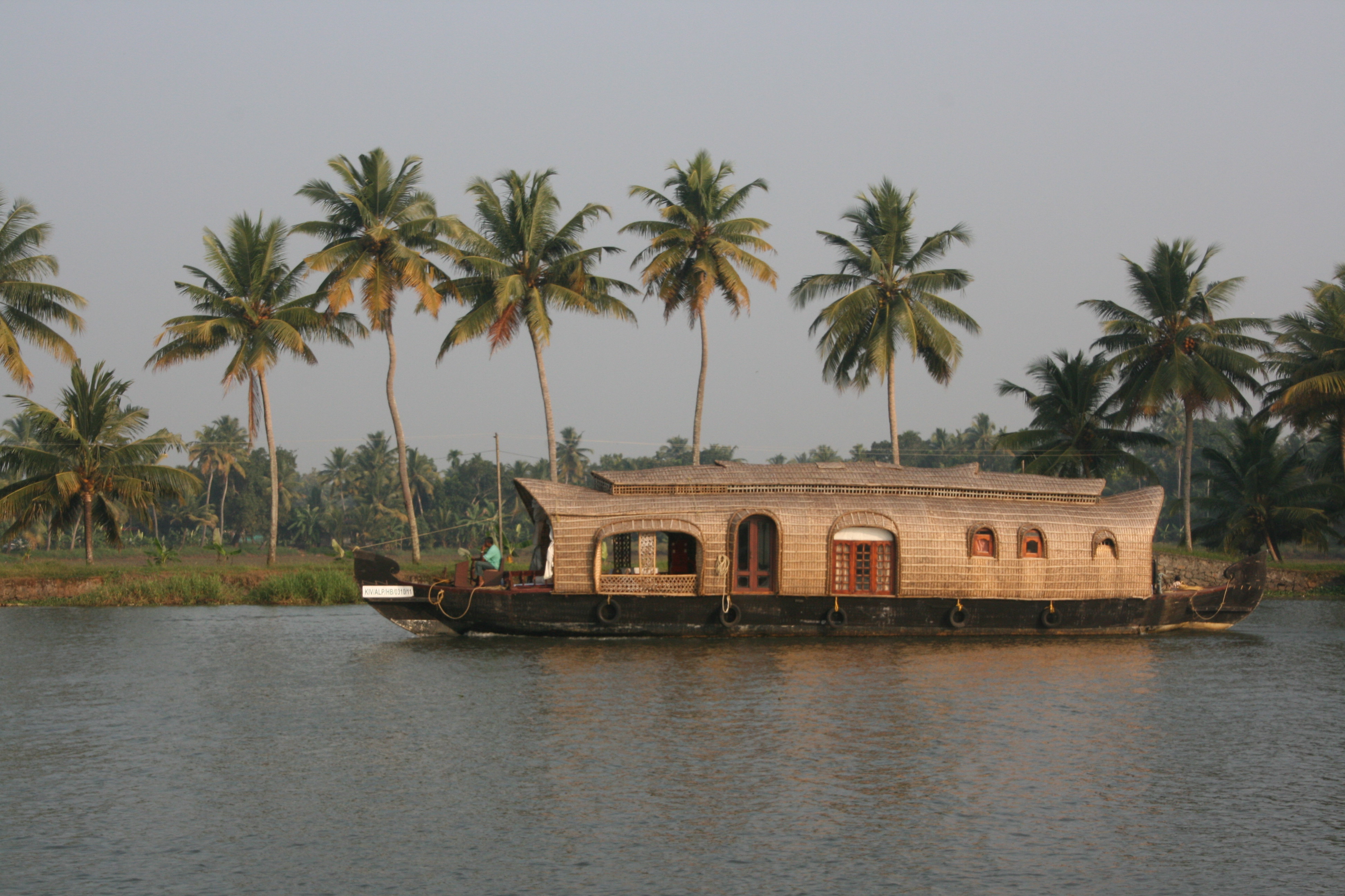 Een zilverreiger landt elegant op de rug van een waterbuffel die met zijn poten in het water staat, omgeven door paarse en witte lelies. Op de achtergrond wuiven bananenplantages en palmen. Zo’n scène zie je vanuit je woonboot die langzaam over de kalme backwaters van Kerala glijdt.