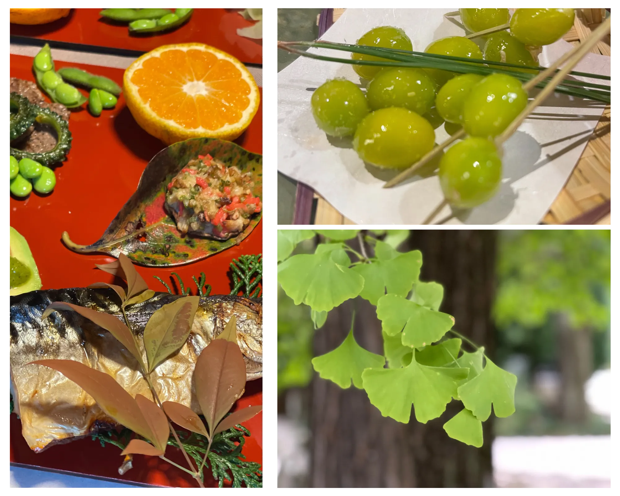 Naast dit schaaltje staat een rieten mandje met ginnan, smaragdgroene vruchtjes die de kok aan stokjes heeft geprikt. De heldere kleur groen valt meteen op. Is dit nou een druif of een olijf misschien?