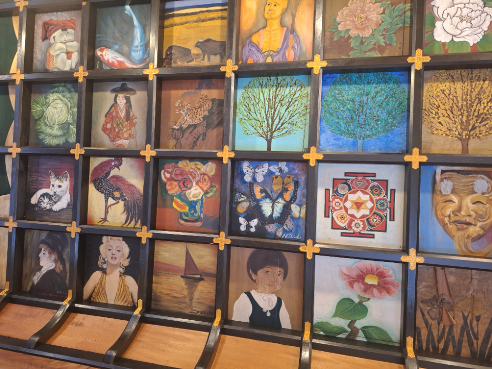 Na een paar dagen in een écht bed met een zacht kussen trek ik mijn wandelschoenen weer aan en vervolg ik mijn weg naar Iwamoto-ji (tempel 37). Een bijzondere plek, met een excentriek plafond vol meer dan 500 schilderingen. Van boeddhistische taferelen tot Marilyn Monroe, hanen, katten en abstracte kunst, je kijkt er je ogen uit. Het is er warm en comfortabel, maar de wekker gaat vroeg: om 6 uur ’s ochtends begint de dienst.
