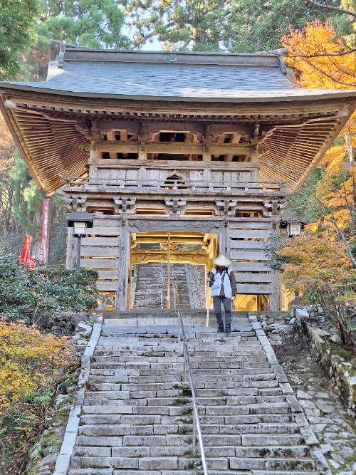 Mijn Shikoku-avontuur begon meteen goed, met twee van de meest sfeervolle tempels langs de route. De paden naar Kakurin-ji (tempel 20) en vervolgens Tairyu-ji (tempel 21) vroegen flink wat klimwerk, maar dat werd ruimschoots beloond met stille bossen, frisse berglucht en een bijna magische sfeer onderweg. De bentobox die ik van mijn host meekreeg, maakte het plaatje compleet. Het zat vol kleine hapjes die eruitzagen als cadeautjes, compleet met strikjes en lintjes. Met een herfstblaadje en een lief briefje erbij voelde het alsof alles met heel veel aandacht en liefde was klaargemaakt.