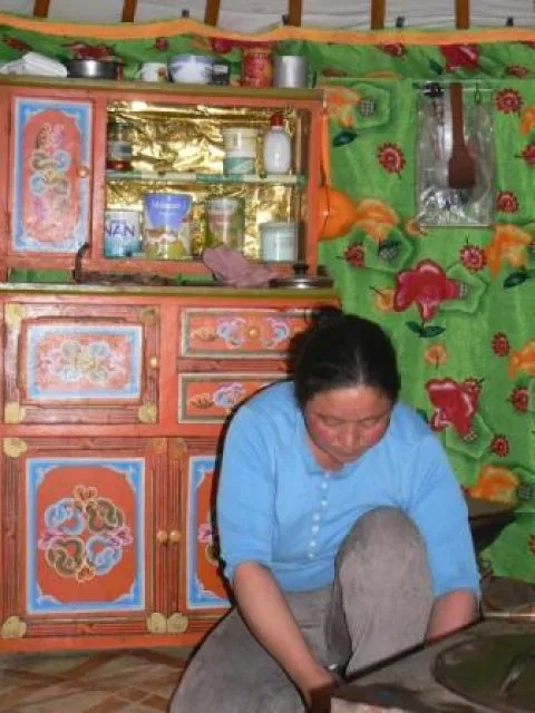 Een slank meisje zit bij de kast aan de westzijde, de kant van de vrouw, en kneedt deeg met een houten stok op een houten plank. Een tweede vrouw –formaat groots- zit bij de stoof net voor het meisje. Ze gooit er een hele bak gedroogde koeienpoep in. Het vuur laait op en vrijwel direct verwarmt het de hele ger. Heerlijk. De ger is rondom behangen met vrolijk gekleurde doeken. Weliswaar synthetisch en in de meest schreeuwerige kleuren maar het past verdraaid lekker bij de rustige onopvallende kleur beige van de vilten binnendoek van dit nomadenhuis.