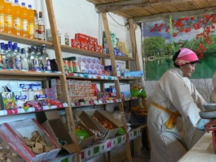 Een trotse Mongoolse vrouw met een prachtige beige wollen deel, een knalgele bus om haar middel geslagen en een turkooizen hoofddoek strak om haar hoofd geknoopt, staat voor de blauwgeverfde deur van haar lemen winkeltje. Kleurrijk verpakt voedsel en karton, plastic en glas lacht ons toe, een verfomfaaide weegschaal staat op de houten toonbank met klazen schuifraampjes aan de voorkant. Het patina op de toonbank van al die handen die er tegen aan hebben geleund tijdens de aankoop van een flessen knaloranje sisi of platgeslagen koekjes, glimt ons tegemoet. In de hoek vinden we een tafeltje met een vrolijk gebloemd plastic tafelkleed.