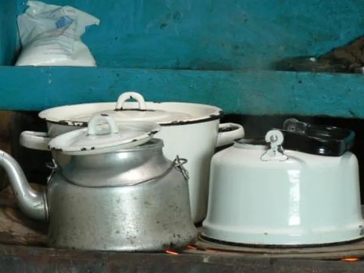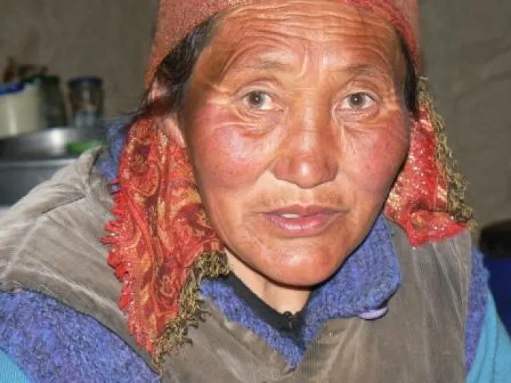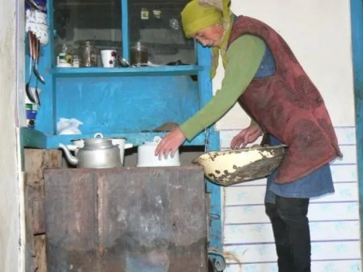 Op de stoof staan twee pannen en een ketel. De vrouw van Ardak, een slanke, bijna knokige vrouw met een vrolijke groene gebloemde hoofddoek strak om het hoofd geknoopt, zit gehurkt bij het vuur. Ze heeft prachtige groene ogen zoals veel Kazachen, heur haar dat stiekem onder haar hoofddoek uitpiept is lichtbruin. Ze schenkt me een stralende lach. Ik schat haar 50 maar ze blijkt 40 te zijn. Het harde leven tekent af in haar gezicht. Ze heeft een grote metalen schaal op haar schoot vol gedroogde yakpoep. Ze schut de hele schaal in de stoof en met een ijzeren staaf pookt ze de boel eens flink op. Het vuur laait op en direct is de warmte die vrij komt voelbaar. Met een kleine plumeau gemaakt van de pluizige zachte staart van een tweejarige yak, zo verzekert Ardak me, veegt ze de kruimels poep nauwgezet van de stoof. Tevreden staat ze op , schenkt me nog zo’n volle lach en verdwijnt maar de voorraadkast in een kleine donkere ruimte die ik de keuken doop. Ze komt terug met vier grote kommen en een thermoskan. Theetijd.