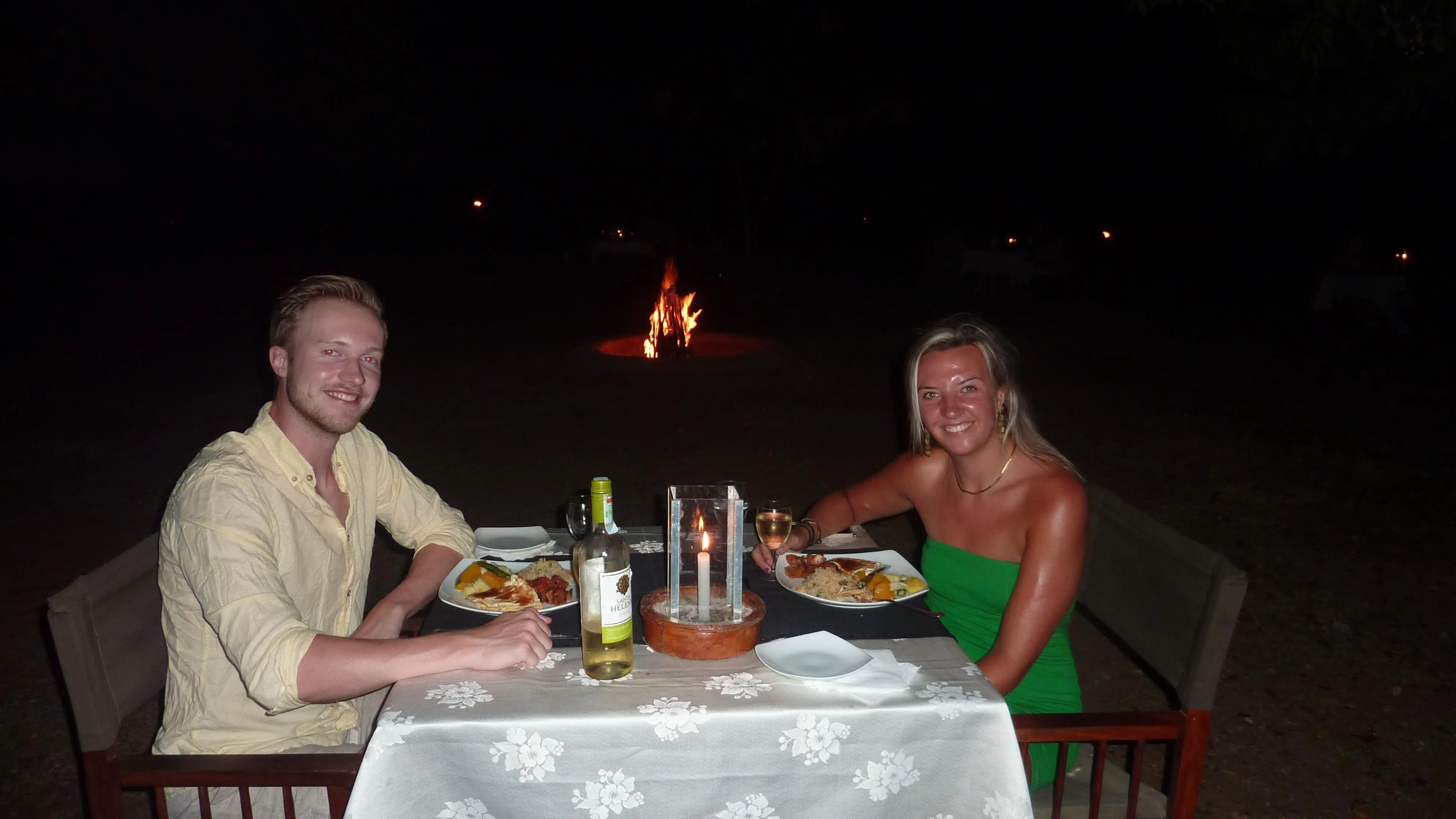 Bij terugkomst op het kamp stonden er heerlijke hapjes voor ons klaar. We besloten even te ontspannen en te genieten van de omgeving voordat we gingen dineren. Toen we later op de avond terugkeerden naar het kamp, werden we verrast door de sfeervolle setting. De tafels waren in een grote cirkel om een knisperend kampvuur geplaatst en de openluchtkeuken, met maar liefst vijf koks, maakte het plaatje compleet. Het diner bij kaarslicht onder de sterrenhemel was fantastisch. Na het diner ruilden we onze nette kleding weer om voor safarikleding en gingen we met de ranger het bos in. Tijdens de avondwandeling spotten we wat grote spinnen en vleermuizen, gelukkig hoefden we met die ingebouwde badkamer in onze tent de tent niet meer uit ;)