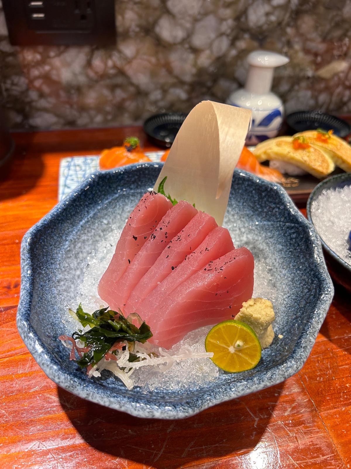 Daarnaast aten we bij een fantastisch sushi-restaurant, waar we genoten van een schaal sashimi met verse vis, tonijnbereidingen, rauwe oesters en andere schelpdieren, begeleid door een glaasje warme sake.