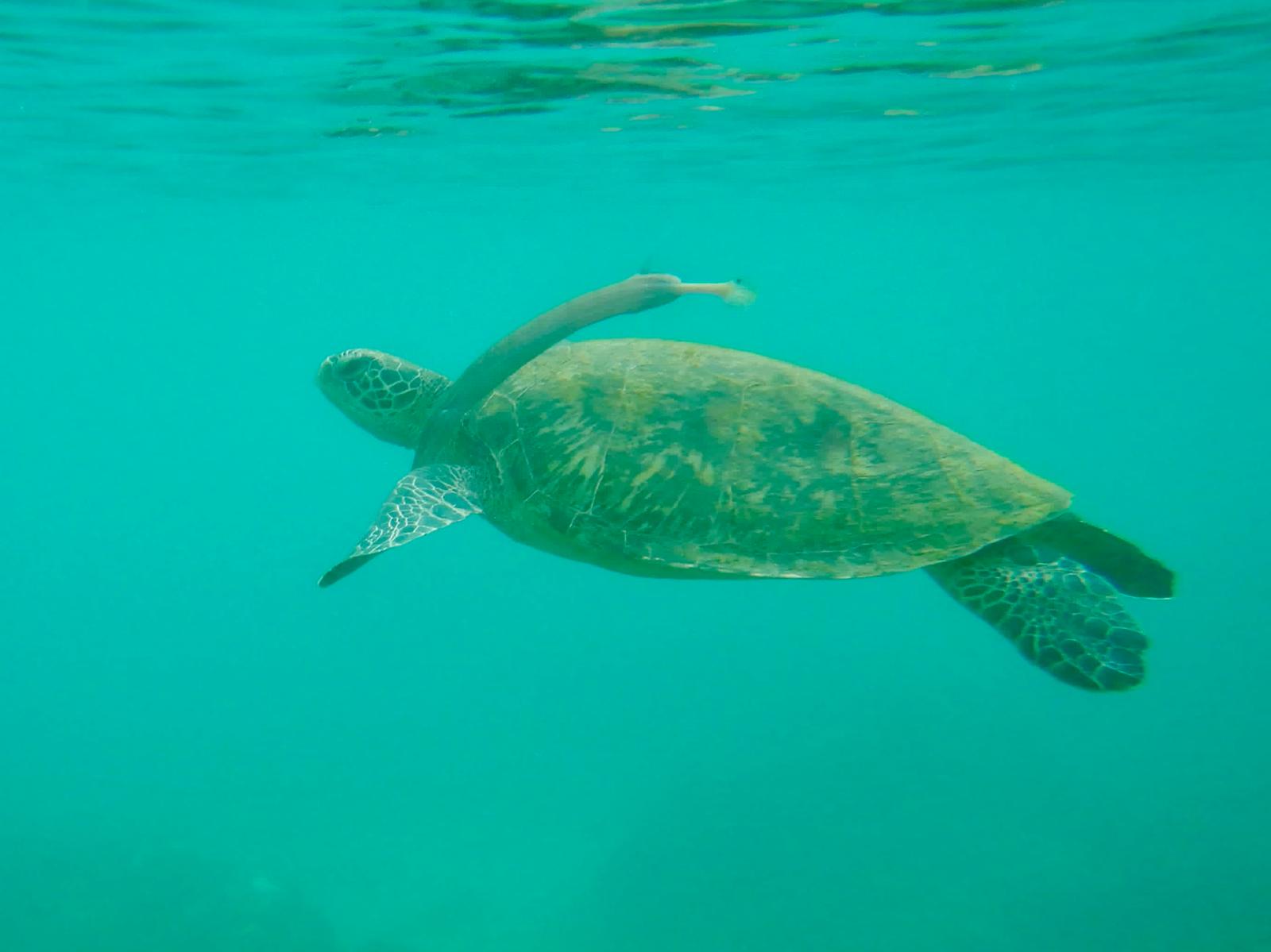 Vanaf een plateau bij Lobster Cave zagen we al de eerste schildpadden door het heldere water zwemmen. Onwerkelijk om ze van zo’n afstand te zien, maar niet vreemd als je bedenkt dat er naar schatting zo’n 700 schildpadden rond het eiland leven.
