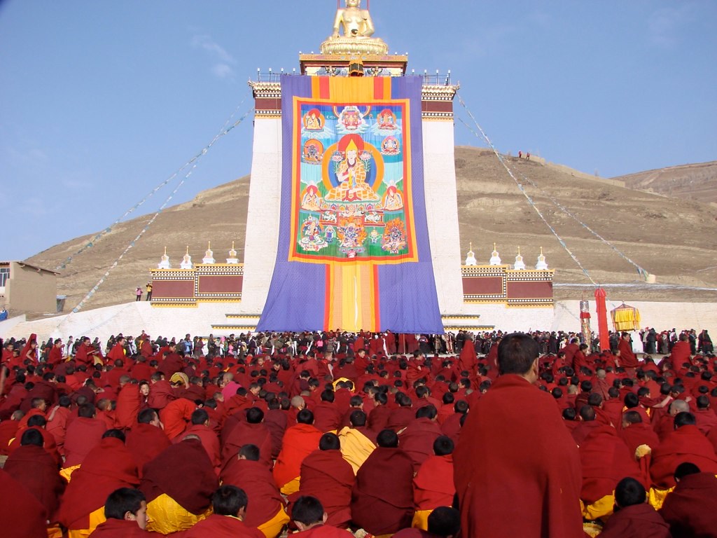 Overal gepreveld door vriendelijk kijkende, kleurrijk uitgedoste nomaden. Ze zijn van verre gekomen om de kora te lopen, de heilige rondomgang rond het klooster. Dat klooster is het Labrang klooster, een van de grootste Tibetaanse kloosters. Niet gelegen in de provincie Tibet, maar wel in historisch Tibet, in de Tibetaanse graslanden van Amdo, bij Xiahe.