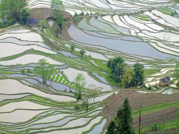 De rit naar Yuanyang duurt ongeveer 3,5 uur. In de omgeving van Yuanyang bevinden zich de grootste rijstterrassen ter wereld. Het is een overweldigend gezicht om alle hellingen vol kleine terrassen te zien. Rond Yuanyang ziet u de meer dan fascinerende terrasbouw van het Hani Volk. De oeroude terrassen die u ziet zijn tussen december en april gevuld met water en dan eigenlijk op zijn mooist. Als u erbij staat voelt het haast onwerkelijk; de kleine terrassen gevuld met water lijken op spiegeltjes die samen een kunstwerk vormen waar de kunstenaar precies de juiste balans heeft weten te vinden tussen lijnen en licht! In de lente komt de groene rijst op, in de zomer is het knalgroen en in de nazomer wordt de rijst geel: klaar om te oogsten. Vooral tijdens zonsopkomst en – ondergang is het een prachtig tafereel. De terrassen worden al eeuwenlang zorgvuldig bewerkt door de Hani (Akha), Yao en Yi volkeren die in dit gebied wonen.