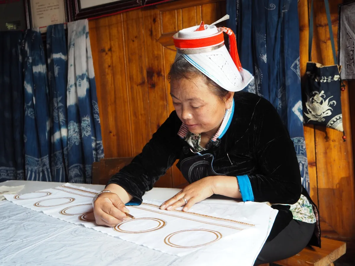 In Shidong is het absoluut de moeite waard om eens goed te kijken naar het borduurwerk waar de lokale vrouwen mee bezig zijn. Gezellig bij elkaar gezeten op lage stoeltjes, borduurwerk op schoot en ondertussen schaterend om de laatste roddels, zitten ze bij elkaar in het dorp. De borduursjablonen maken deel uit van een eeuwenoude traditie die nog steeds standhoudt. Jonge meisjes worden vanaf hun zevende jaar geleerd hoe te borduren, en hoe mooier hun werk, hoe aantrekkelijker ze worden gevonden door de jonge mannen!