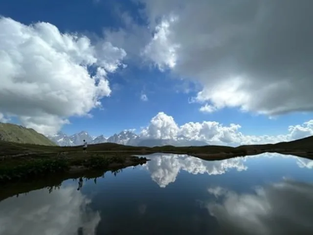 Ook kunt u kiezen voor een andere wandeling met schitterende vergezichten, naar de Koruldi meren (alleen in zomermaanden). U wordt dan per jeep omhoog gebracht en kunt dan verder naar deze kleine meren (maar met schitterende spiegelingen in het water van de omringende bergen) wandelen en een eind naar beneden wandelen, tot een punt waar de jeep u oppikt. Onderweg prachtig panoramisch uitzicht over de bergreuzen van de Kaukasus.