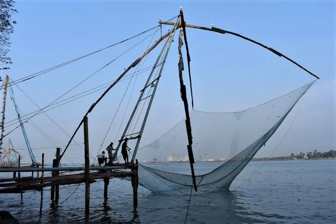de kust van Fort Cochin staan de beroemde Chinese visnetten. Ooit zijn ze hier