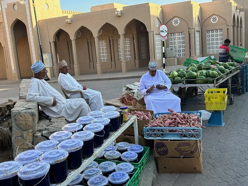 Wanneer u op een woensdag vanuit de Wahiba Sands naar Nizwa reist, kunt u onderweg een stop maken in het kleine stadje Ibra. De dagelijkse souq houdt elke woensdag een traditionele vrouwenmarkt in het overdekte deel van de souq. De vrouwen zijn kleurrijk gesluierd en een aantal dragen opvallende gezichtsmaskers met puntige neuzen. Het is een drukke bedoeling van vrouwelijke handelaars en verkopers uit de hele regio, die prachtige stoffen, geurige wierrook, heerlijke specerijen, kleding, geweven kussens en handgemaakte manden verkopen.