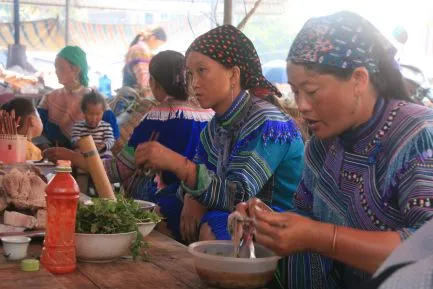 Tijd om te shoppen! Nee, niet in één van de met airco verkoelde shopping malls in Hanoi, maar op de zondagsmarkt van Bac Ha. Deze traditionele markt, waar verschillende bergvolkeren uit de omgeving naartoe komen, is groot en zeer veelzijdig. Hier doet iedereen inkopen, van gekleurde traditionele kledij tot ingrediënten voor het avondmaal. Er is een aparte afdeling voor buffels, honden en katten. Ook is er vlees, vis, groente en fruit te vinden. Ook kleding, kinderspeelgoed en medicijnen kun je hier krijgen. Ik sla mijn slag op de souvenirsafdeling!