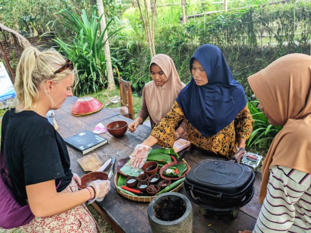 Bij aankomst wordt u welkom geheten door Usman of een van de andere 2 gidsen. Deze twee jongens komen tevens uit het dorp en hebben een Engelstalige training gevolgd om te mogen gidsen. Een van hen staat voor u klaar met een zelfgemaakte Jamu: een eeuwenoud Indonesisch kruidendrankje (vaak gemaakt van gember, kurkuma, citroengras en wat losse kruiden) met medicinale werking. Met verse gember vooral een powerboost om aan de dag te beginnen!Het belooft een interactieve dag te worden; zo mogen vrouwen meehelpen weven, kunt u helpen met het branden van koffie, is er een fruitspeurtocht uitgezet voor kinderen en krijgt u een rondleiding over de verschillende groente en fruittuinen. De rondleiding neemt zeker een hele dag in beslag. De dag sluit af met een zelfbereide maaltijd en een transfer naar Kuta Lombok.