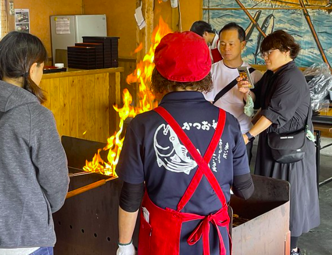 Na de bagage te hebben afgeleverd, staat de eerste bijzondere activiteit al op het programma. In Myojinmaru Hanare krijg je zelf kersverse katsuo (kleine tonijn) in handen waar Kochi zo beroemd om is. Grillen maar! De chefkok snijdt je eigen katsuo in gepaste stukjes en je geniet van de katsuo omringd door andere kleine gerechtjes die uitstekend passen.