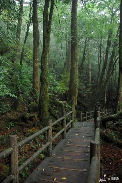 is bedekt met weelderige groene bossen waar Japans oudste levende bomen staan.