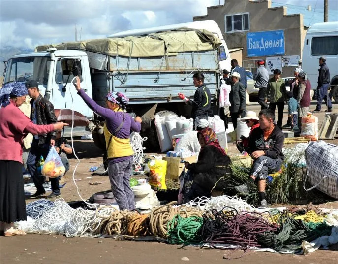 grootste van Centraal-Azië. Overal kraampjes, kopers en verkopers. Veel