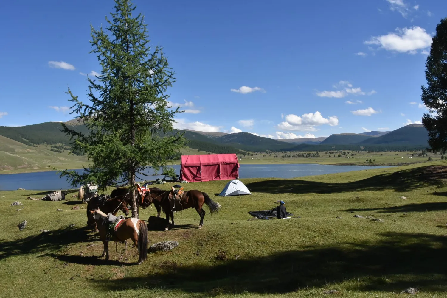Een rustdag bij het Huisiin Naiman Nuur meer, gelegen op 2500 meter. Letterlijk betekent dit 'de 8 meren van de navel'. Het meer ligt midden in de Khangai bergen en is ooit door een uitbarsting van vulkanen ontstaan. de diverse meren zijn verbonden met stroompjes die tezamen het Huisiin Naiman Nuur meer vormen.