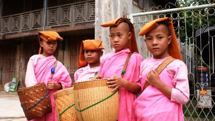 Hello Miss Hello Miss … Overal op de U Bein’s Bridge word mij gedag gezegd. Een prachtige plek waar Birmezen ook graag komen. De gids vertelt mij dat de brug in 1849  is gebouwd en afgelopen winter nog voor een deel was ingestort vanwege de hoge waterstand. Een beetje onzeker wandel ik dus deze brug over. Rond 10:30 uur lopen we in sneltreinvaart naar Amarapura om te zien hoe tientallen jonge monniken van de kloosterschool in rijen door de straat lopen om hun eten in ontvangst te nemen in hun bedelnappen zoals het Birmees boeddhisme voorschrijft. Een interessant fenomeen dat ik nooit eerder heb mogen zien. Ik neem een kijkje in de keuken waar de stank, honden en vliegen mij tegemoet komen. Langs de weg zie ik diverse kinderen met schaaltjes op schoot zitten, ik vraag aan de gids wat ze doen? Hij vertelt mij dat deze arme kinderen de restjes krijgen. Ik heb gelukkig nog wat snoepjes en kleurpotloden in mijn tas en geef deze aan de kinderen er verschijnt een grote glimlach.