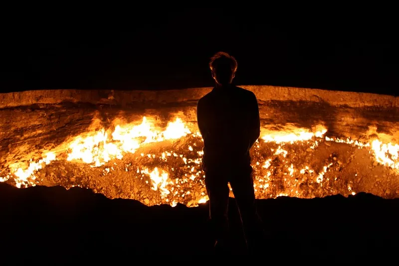 De eerder genoemde Altyn Asyr Bazaar kunt u op donderdag, zaterdag en zondag ook bezoeken op weg naar de gaskrater van Derwaza. Deze spectaculaire krater, midden in de Karakuum-woestijn, staat al decennialang in brand. Het is geen natuurfenomeen, maar een vergissing van Sovjet-geologen. In de jaren ’70 werd hier geboord op zoek naar olie en gas. Opeens stortte de grond in en ontdekten ze een ondergronds grottenstelsel met een gasvoorraad. Om het probleem op te lossen staken de geologen het gas in brand, en het brandt nog steeds.